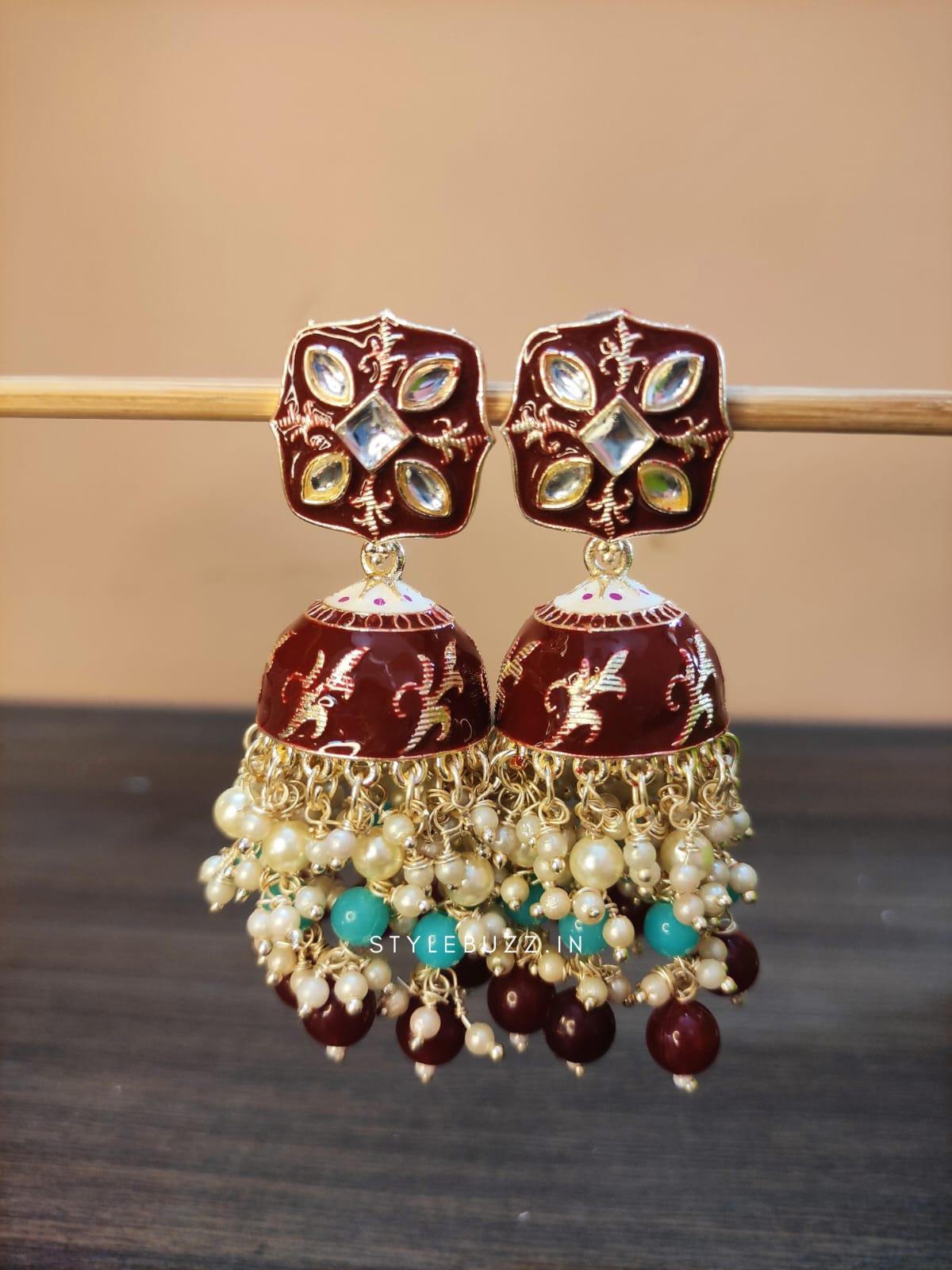 Enhance your bridal look with our stunning Bridal Meenakari Maroon Colored Earrings. These beautiful earrings feature traditional Meenakari design in a rich maroon color, adding a touch of elegance to your special day. Complete your bridal ensemble with these statement earrings.