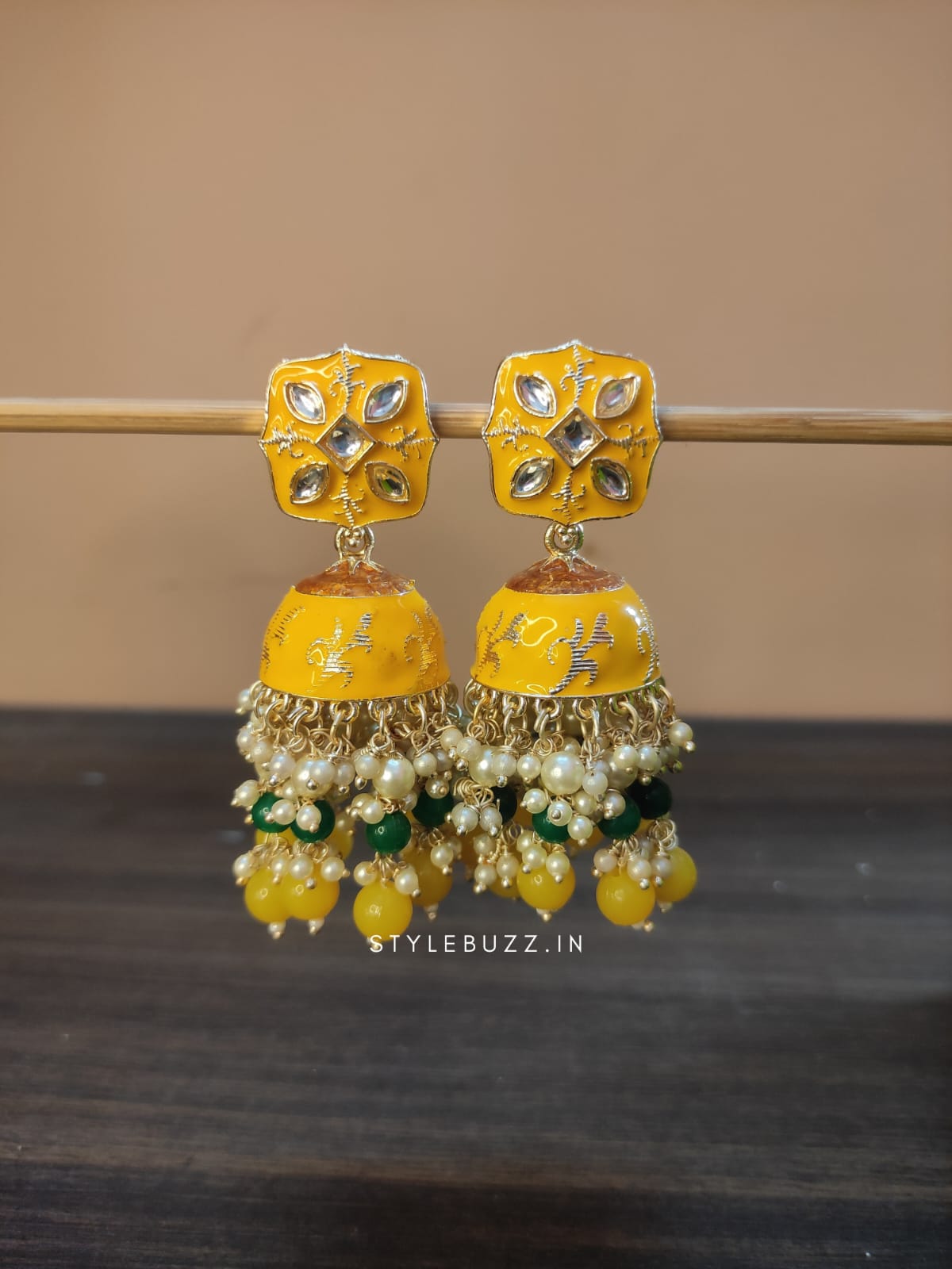 Introduce a touch of traditional elegance with the Meenakari Radhika Yellow Colored Jhumka. This beautiful piece is designed to be free-size and perfect for the festive season. Stand out from the crowd with its vibrant color and intricate Meenakari work. Elevate your style and embrace the cultural beauty.