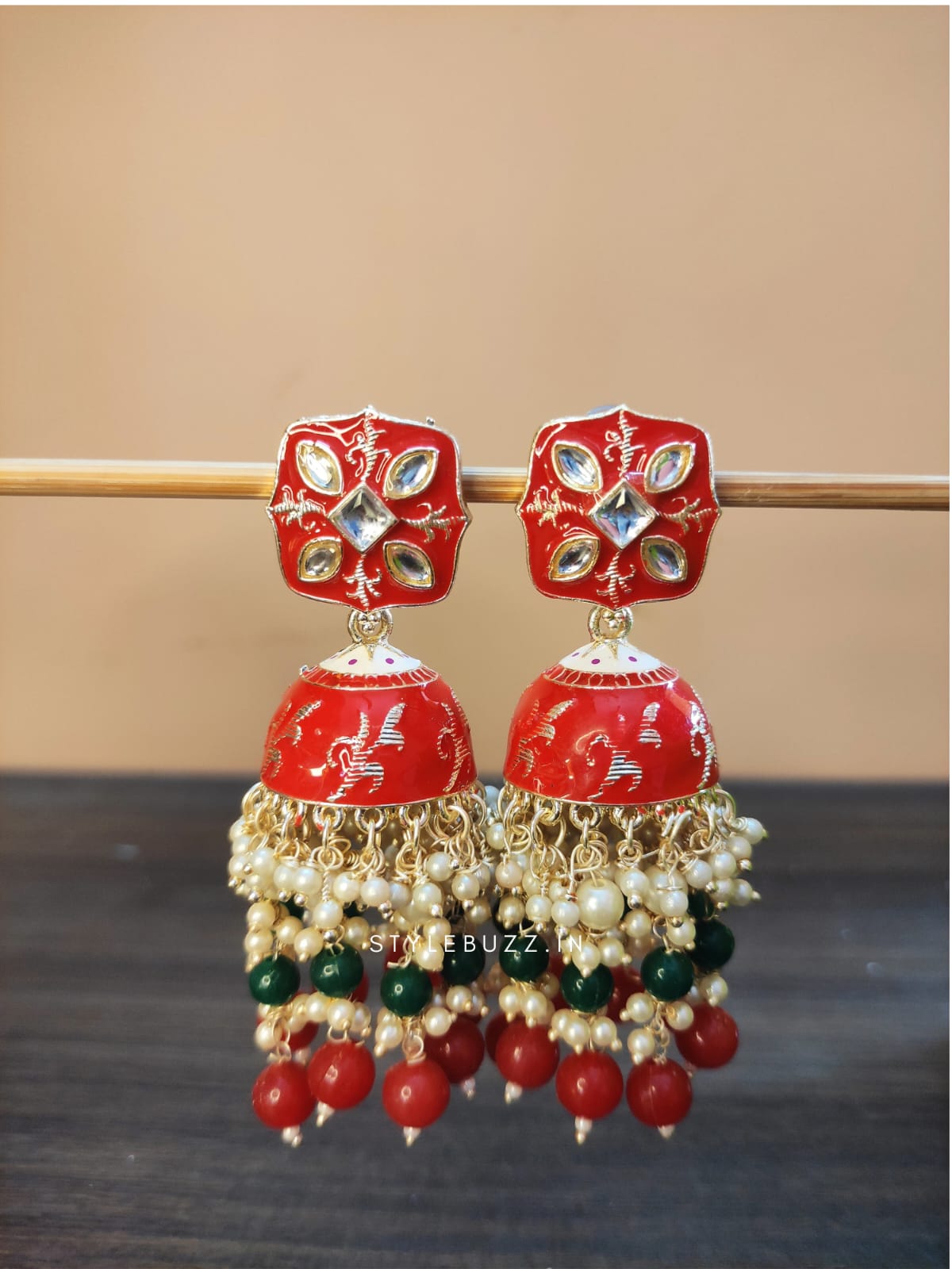 These Meenakari Red Colored Latest Earrings are perfect for adding a touch of style to any festive outfit. With their fancy design and adjustable size, they offer both elegance and comfort. A must-have for any festive occasion.