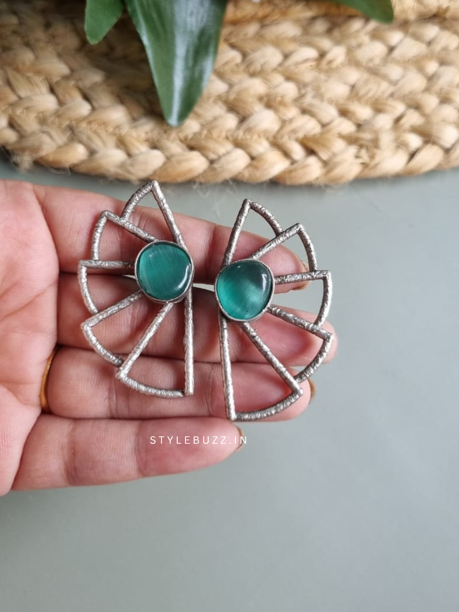 This elegant silver replica stud showcases a stylish design and features a beautiful green stone. Its trendy design is perfect for any occasion and adds a touch of sophistication to any outfit. Elevate your style with this fancy piece.