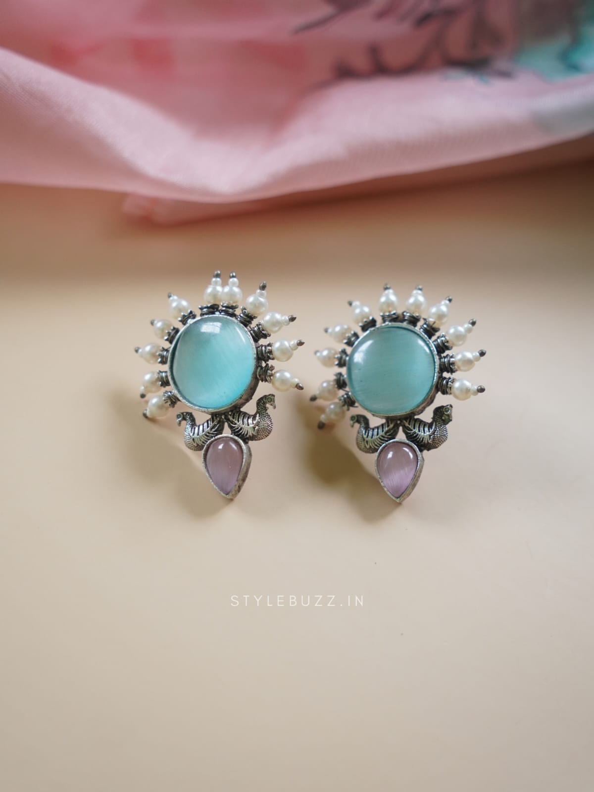 Silver Replica Sky And Purple Color Stoned Premium Earrings