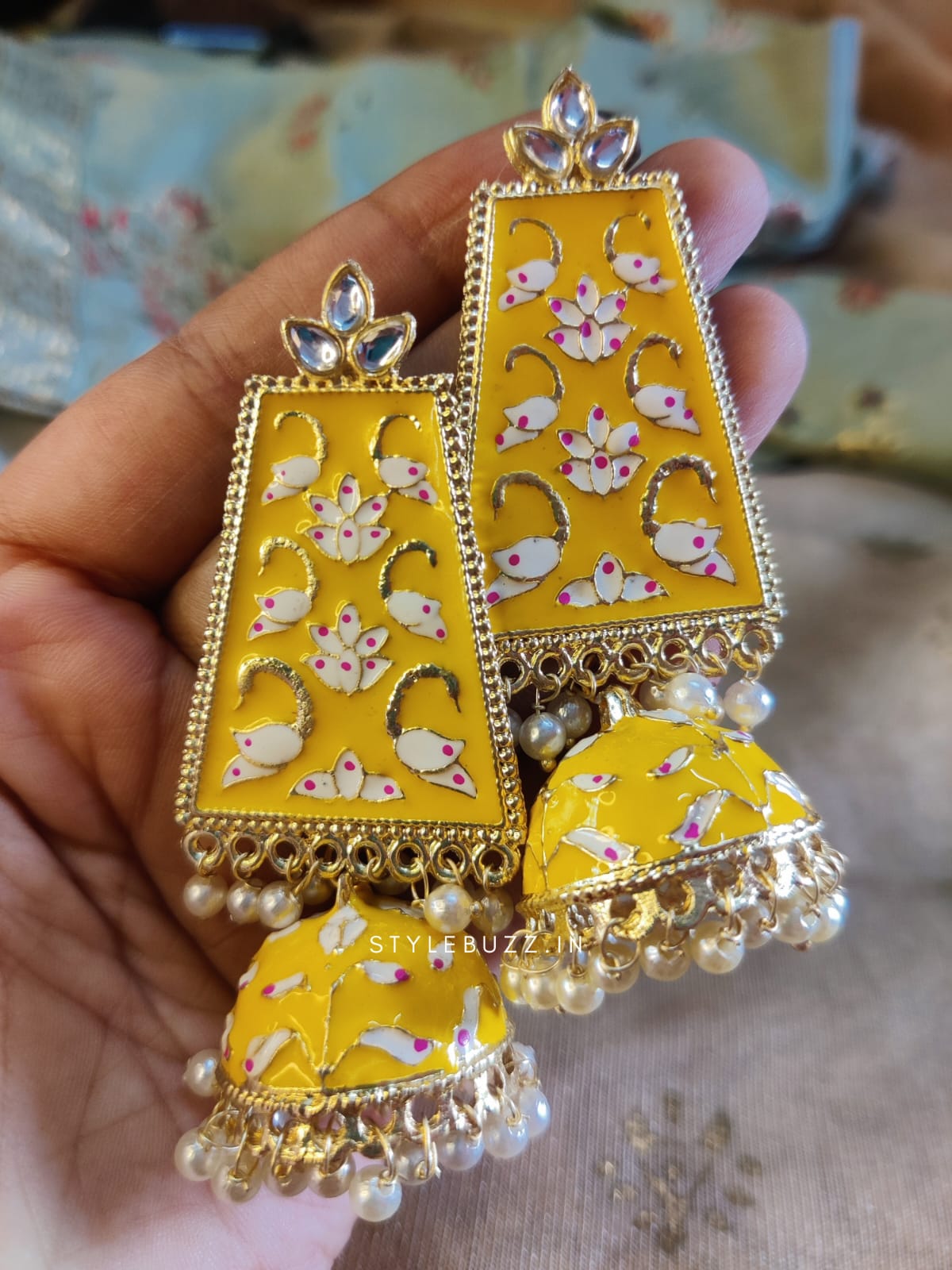 These gorgeous yellow Minakari earrings are the perfect accessory for any festive occasion. The unique coloring and stylish design make them a must-have for any fashion lover. With their vibrant color, these earrings are sure to add a touch of elegance to any outfit. Don't miss out on these stunning pieces!